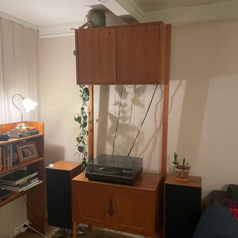 Skjenk til oppbevaring av stereo og LP- plater, designet av Rudi Wulff. Heltre eik,