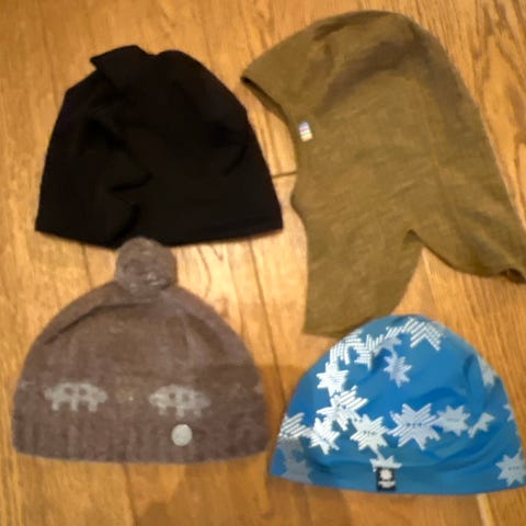 Den ene er i 100% merinoull og er pent brukt. Den andre er mer brukt, og i ull og bomull.