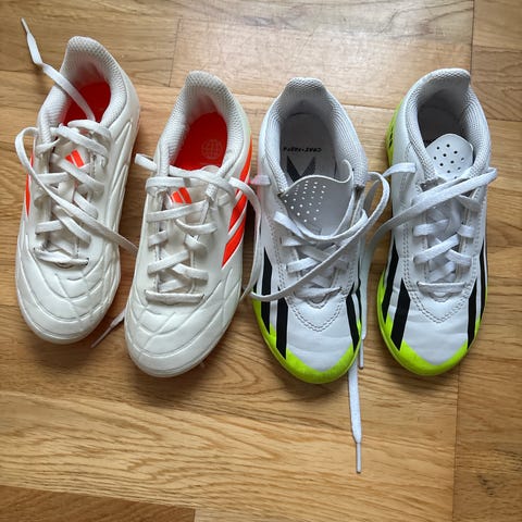 Adidas fotballsko i hvit med gule detaljer. Skoene har lisser og er designet for fotballbruk. Størrelse 30