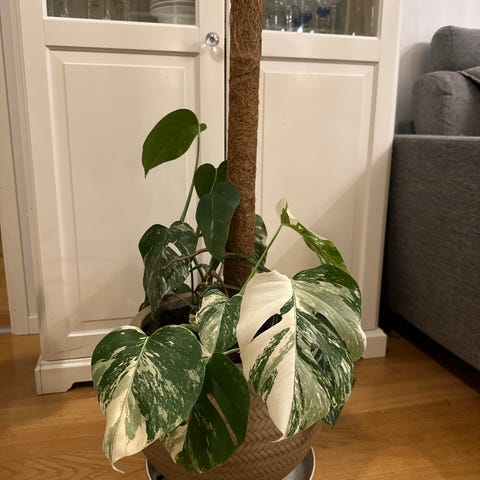 Monstera Variegata potteplante med grønne og hvite blader. Planten er egnet for innendørs bruk og krever moderat lys og vanning. Leveres i svart potte. Må hentes.
