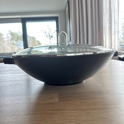 Lite brukt wokpanne i jern. Solid og god med 2 håndtak og lokk.