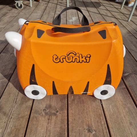 Trunki tigerkoffert med noen bruksmerker nederst på koffertens tigerstriper.