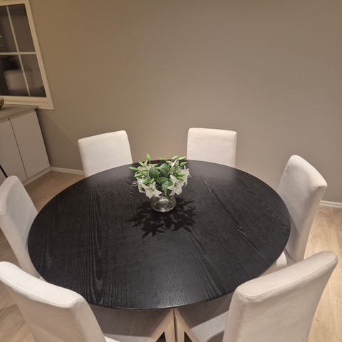 Selger 6 stk kongeblå Cloud spisestoler i velour fra Danform. Brukt i noen år, men regelmessig støvsugd og rengjort. Ingen skader i trekket. Mange års bruk igjen. Lett å rengjøre, støvsug med kost og bruk våt mikrofiberklut til å vaske ev flekker.