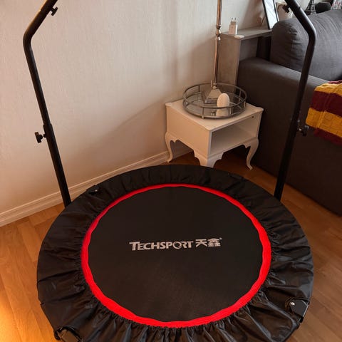 Sport Supply minitrampoline med blå kantbeskyttelse. Egnet for trening og lek innendørs. Kompakt størrelse som passer for hjemmebruk.