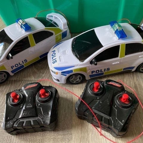 Top Model radiostyrte biler inkludert en politi bil og en formel 1 bil. Leveres med to fjernkontroller for styring. Egnet som leketøy for barn.