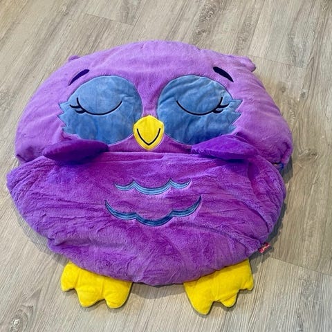 Selger en søt og myk sovepose i form av enhjørning, kjøpt hos Jollyroom. Perfekt for barn som liker å sove koselig – kan brukes både som sovepose og stor kosepute.