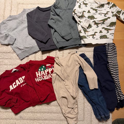 Klespakke i str 92 med fleece-sett, cardigan, gensere og bukser.
