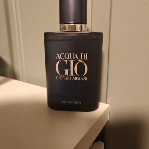 Giorgio Armani Acqua di Giò Profondo parfyme. Flaske med mørk design, egnet for bruk som herreduft. Anslår det er igjen 35 - 40 ml. Dette er en 75 ml flaske. Ca 3 år gammel. Ikke magnetisk cap.