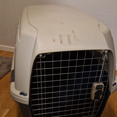 Vår hund ville ikke bruke bur, kan få med hvitt pledd som legges over (litt oransje for hu spiste gulrot på den)