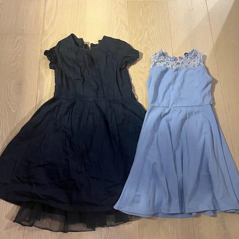 To kjoler i i størrelse 152 til jente (noe små i størrelsen). Den blå kjolen er brukt en gang, den rosa er ny, med lappen på. Kjolene har elastisk midje og korte ermer, egnet som sommer- eller vårplagg.