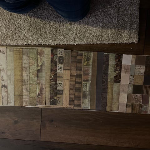Papirark i ulike farger og mønstre. Arkene varierer i farge og design, egnet til hobby- og håndverksprosjekter.