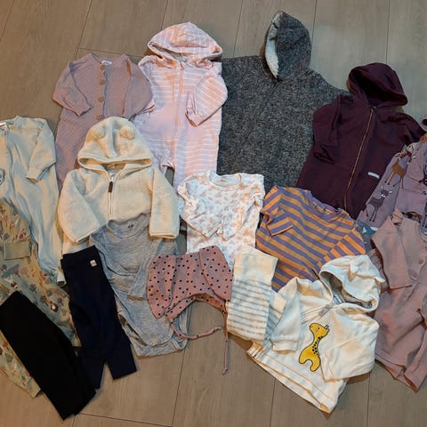 Klespakke jente str 68. Inkluderer Polarn o. Pyret vindfleece, sokker, luer, buksedresser, bodyer, gensere, bukser, kjoler, nattdrakter, ull, strikk, etc.