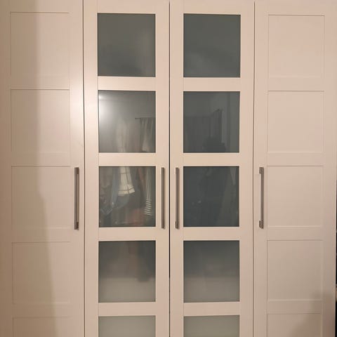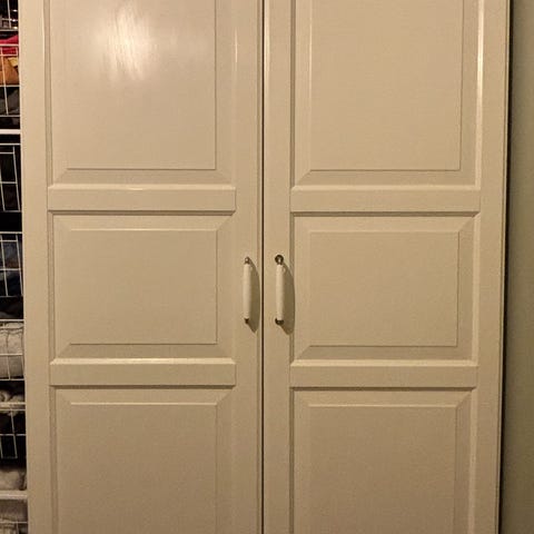Komplett innredning med skuffer og hyller, slik som på bildene. Inkludert 6 stk beige oppbevaringsbokser.
