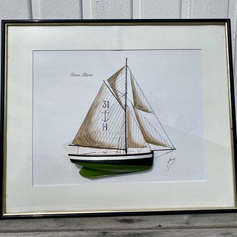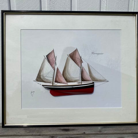 Innrammet svart-hvitt bilde som viser en seilbåt med seil i bevegelse. Bildet har en sort ramme og hvit passepartout. Det er en synlig skade på passepartout i nedre høyre hjørne. Ikke altfor synlig. Bildet måler omtrent 100x100 i høyde og bredde