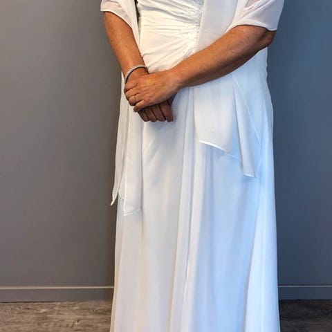 Brudekjole fra Agape. Brukt en gang, hehe. Veldig fint utsmykket, pent slep. Står str 14.. Jeg som har brukt den er 157 og veide rundt 70 når jeg brukte den. Følger også med underskjørt med "rockering" som gjør at den står utover. Kjolen er renset. Fant noen små flekker, men tror disse vil forsvinne med sitronsåpe.