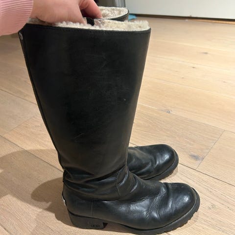 Svarte UGG vinterstøvler i størrelse 37. Støvlene har høyt skaft og er i ekte saueskinn for varme og komfort i kalde forhold. Yttersålen har godt mønster for grep på vinterføre.