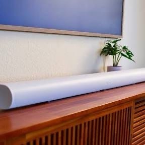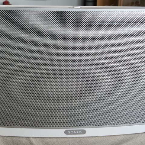 Sonos Play:5 trådløs høyttaler i hvit farge. Høyttaleren har integrerte kontrollknapper for volum og lydstyring, samt tilkoblingsmuligheter via strøm- og nettverkskabler. Designet for bruk i hjemmemiljø med fokus på lydkvalitet.