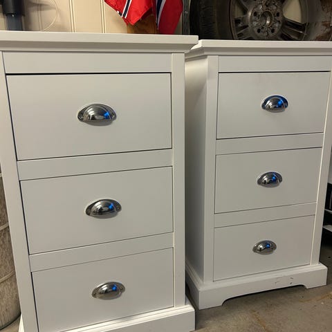 Selger to pene og praktiske nattbord med et klassisk uttrykk. Nattbordene har dekorative detaljer på skuffefrontene og stilige, mørke skålhåndtak som gir et snev av rustikk sjarm eller "landstil".