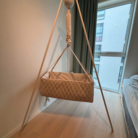 Mulig å kjøpe i pakke med Leander-vugge med stativ, kalesje og madrass, passer perfekt i Leander-stativet (+1000 kr ved kjøp sammen)