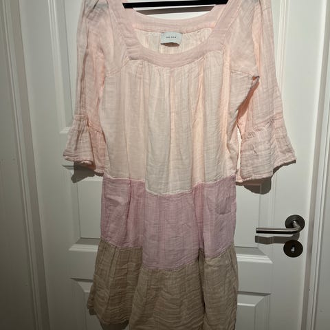 Neo Noir sommerkjole i størrelse 42, laget av bomull. Kjolen er hvit med blå blomsterprint, har lange ermer med smock-detaljer ved mansjettene, knappelukking foran og en smock-detaljert midje. Materialet og designet gjør den egnet for sommerbruk. Den er foret. Brukt en kveld. Så ingen slitasjer eller skader. God i størrelsen pga strikk i midjen. Selges kr 250