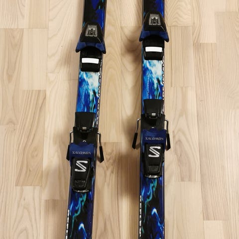 Alpinskiene er pent brukt, ingen spesielle skader over eller under. Sålen er som ny, bindingene er gode. Passer godt til ungdommer, barn som ønsker å kjøre fort.