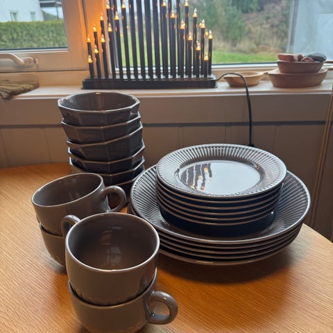 Alle deler er lite brukt, helt intakte og uten skår. Kaffekoppene har aldri vært brukt.
