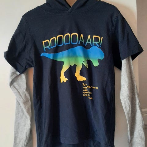 To bomullsgensere med Dinosaur motif str 122-128, pent brukt. Selges samlet for 150 kr.