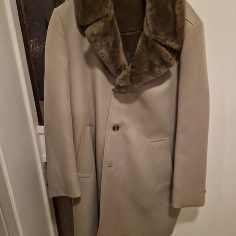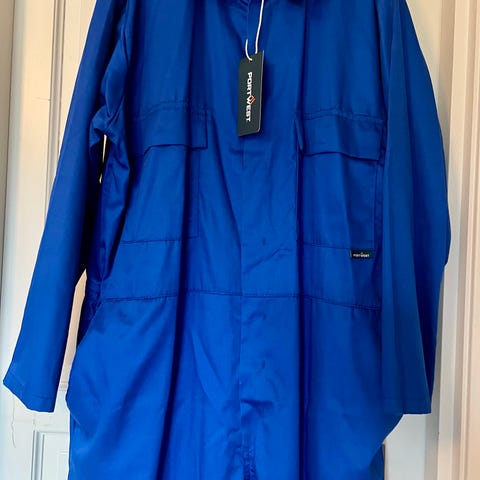 has a short zipper in front and one chest pocket, collar, back yoke with vents, long sleeves with ribbed cuffs, and attachment for in-between the legs to keep the pants in place. Chest circumference, measured just below the armpits, about 122 cm.