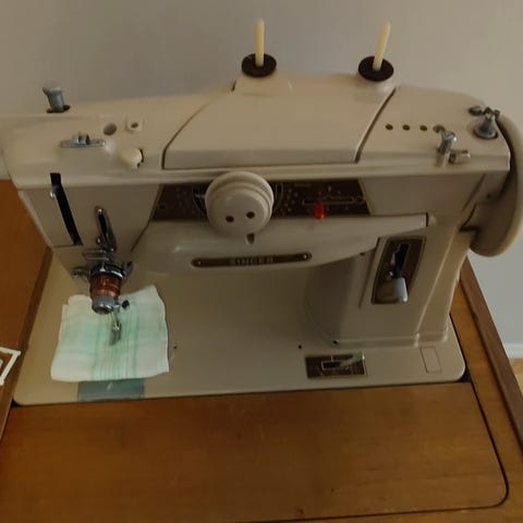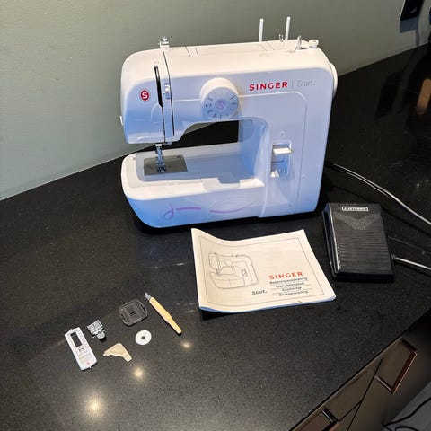 Singer Simple 3210 symaskin med flere sømfunksjoner. Maskinen er hvit med røde detaljer, designet for enkel bruk og allsidig sying.