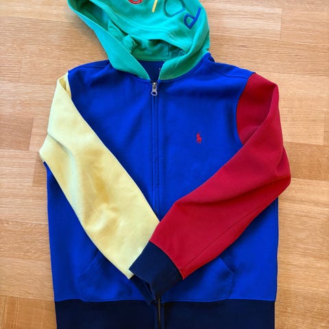 Grå Polo hettegenser, str L (14-16). Opplever den som liten i størrelsen, så tilsvarer ca 158. Ble brått for liten her. Kan se at den er brukt på ermer og nederst, ellers ingen merker, rifter e.a.