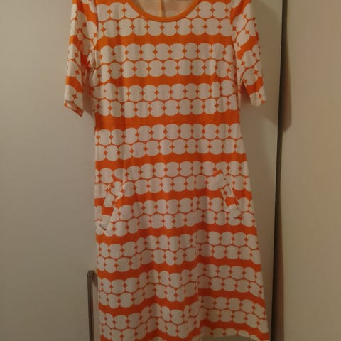 Mørk oransje (litt mørkere enn på bildet), tykt, vaffelmønstret stoff, A-form, 3/4 arm, foret bærestykke.