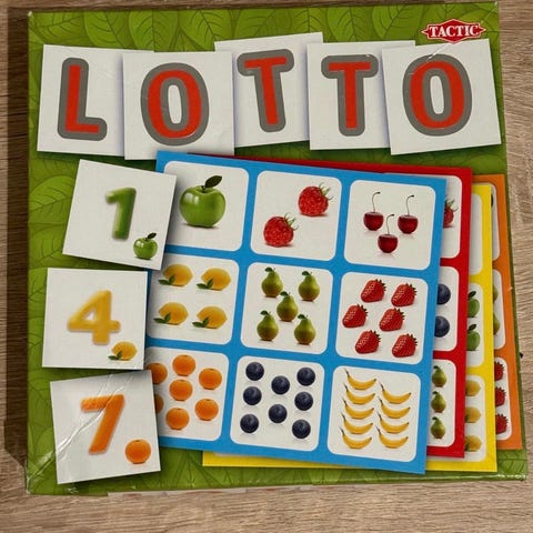 Snøfall Lotto brettspill for barn fra 3 år. Spillet inkluderer brett, brikker og instruksjoner, og har et vintertema med illustrasjoner av snøfall og vinteraktiviteter.