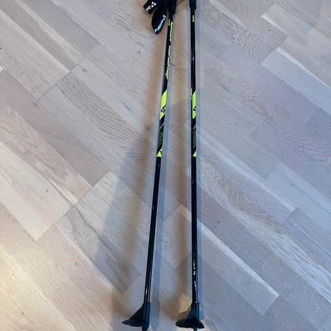 Madshus langrennsski med tilhørende staver, egnet for langrenn. Fischer skisko i svart og gult, med god såle for feste og gli. Passer for langrennsskiutøvere som trenger komplett utstyr med ski, staver og sko.