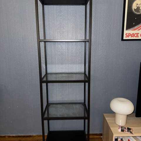 Reol i glass og metall selges. Nederste og øverste plate er i treverklignende plast, de andre tre platene er i glass. Disse løftes enkelt av for transport og vask.