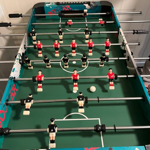 Lekekassen bordfotballspill i blå farge. Spillet har klassisk design med røde og gule spillere, poengteller og svart understell. Egnet for innendørs bruk og sosialt samvær.
