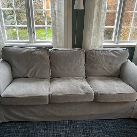 En god og fin sofa i ganske god stand. Fargen har blitt litt blekket ut av sola, men utenom det så er den i god stand. Putene er mjuke og gode å sitte på. Det er 2 seter på den, men de er store nok for 3 personer. Merke Ikea. Prisen kan diskuteres. Må hentes!