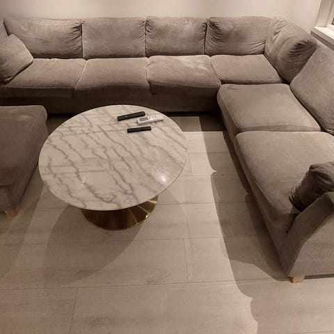 Brun sofa i skinnimitasjon. Pent brukt. Vendbare puter. Litt lysbleking på baksiden av noen ryggputer. Eller fin og hel, god å sitte og ligge i.