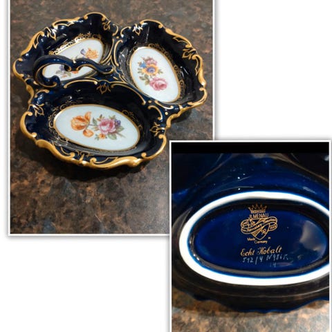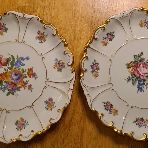 Pent, ovalt serveringsfat fra Feltmann Weiden, produsert i Tyskland (Vest-Tyskland). Håndmalt blomsterdekor med gullkant. Fremstår i meget god stand uten skår eller sprekker.
