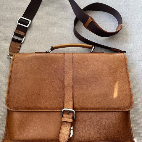 Moods of Norway laptop veske. Vesken er laget av lær og har flere lommer og rom for oppbevaring. Den har glidelås og detaljer som gjør den praktisk for organisering av små gjenstander.