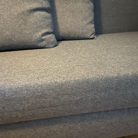 Sofaen er støvsugd etter beste evne, men trekk er ikke vasket.