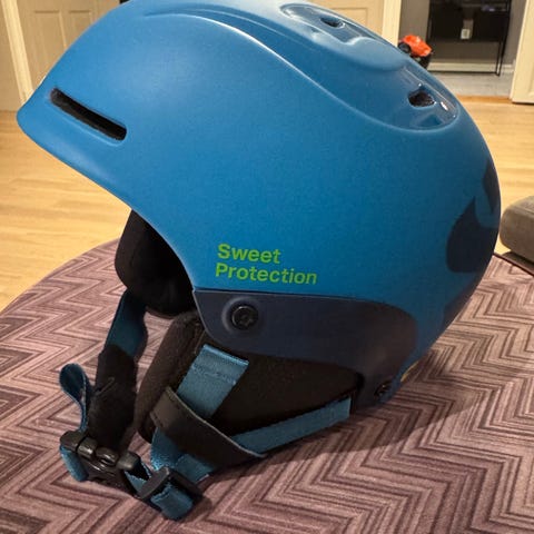 Hjelmen er kun brukt én gang, da den var for liten. Eldre modell (2016?).