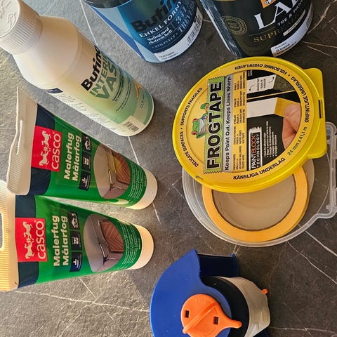 Diverse rester selges samlet for 100 kr. Fugekryss full pakke, resten brukt litt av.
