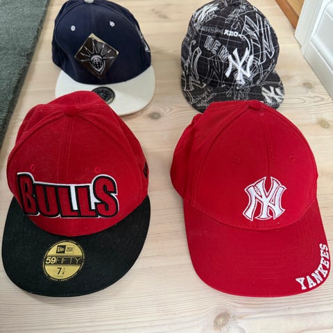 New York yankees caps og en sort enkel caps som har en liten rift i strikken på innsiden. Ses ikke når man har den på.Se bilde.