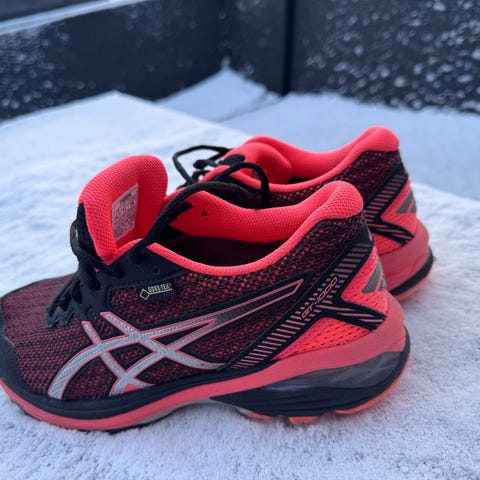 Asics Gel-Nimbus 27 løpesko i størrelse 39, svart farge. Egnet for løping. Skoene har en hvit såle og svarte overflater med hvite detaljer. Som å løpe på en sky! Dessverre passet ikke droppet min fot. Brukt i litt over 1/2 års tid, men som du ser på sålen er de sparsomt brukt på den tiden😊