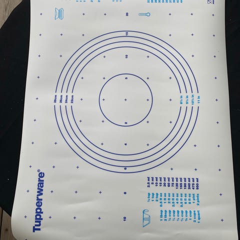 Brukt en gang. To tynne matter i silikon som kan legges på hver sin side av fondanten når den skal kjevles ut. Mønster på den ene matten viser størrelser og hjelper deg å nå de rette målene under kjevlingen.