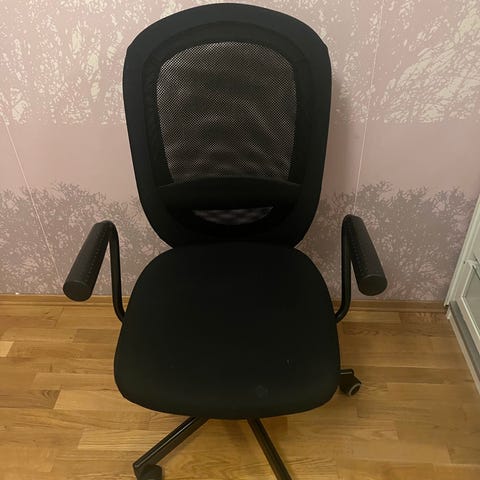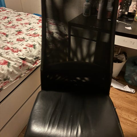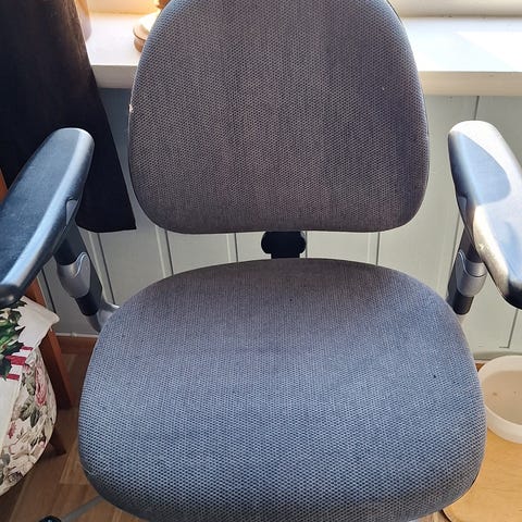 Kontorstol med vattert sete og trekk i boucléstoff. Ben i pulverlakkert metall med hjul. Vippemekanisme og dreibar plate.