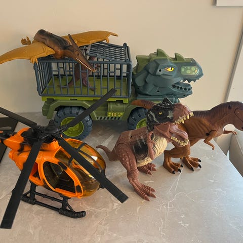 Diverse dinosaurer + bok Rampete Robins Fakta om Dinosaurer