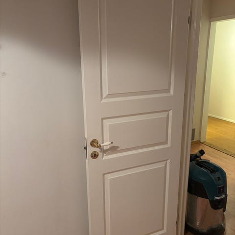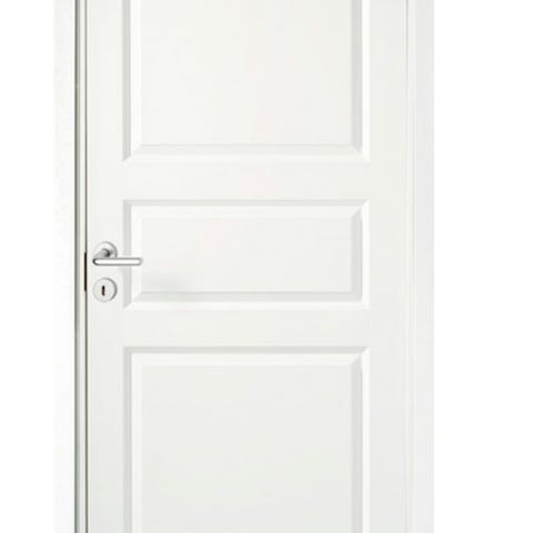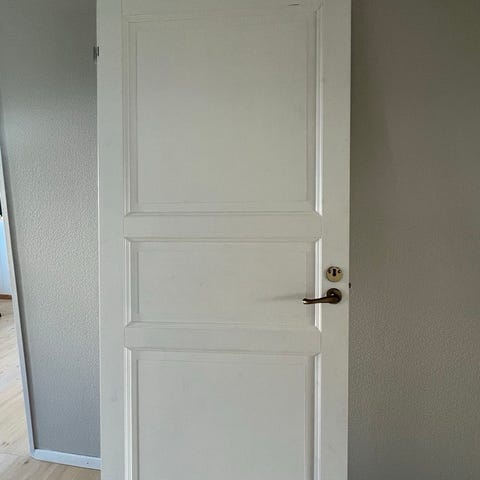 Innerdør i hvit utførelse med klassisk profilert design. Døren har tre innfelte paneler og er utstyrt med dørhåndtak i messingfarge.