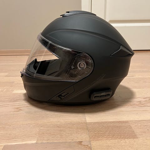 Integrert Sena Bluetooth-system fungerer som det skal (intercom, musikk, samtaler osv.). Visiret er pent og uten problemer, lufting fungerer bra, og hjelmen er godt vedlikeholdt.