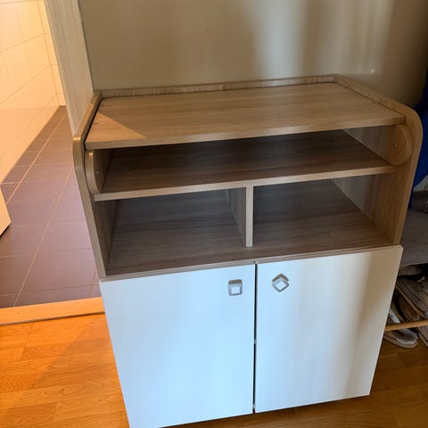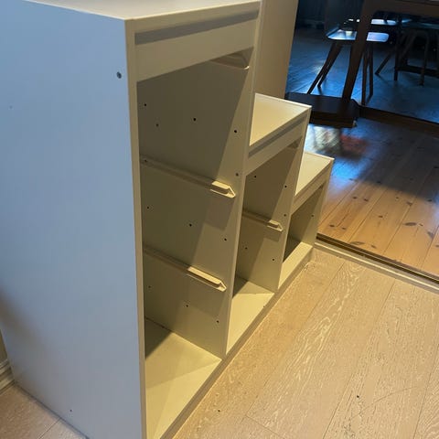 Oppbevaring kommode med åpne rom og fire skuffer med kremhvite fronter. Laget i tremateriale. Egnet for oppbevaring av leker, bøker og annet barnerelatert utstyr. 160 cm lengde, 72 cm høy og 40 cm dybde. Her er to oppbevarings kommoder satt sammen til en. Men selges sammen. Må hentes.